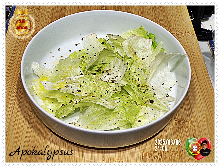 ❹ Acompanhei com uma salada de alface icebergue temperada com o condimento de azeite e pimenta de moinho 4 Bagas.
