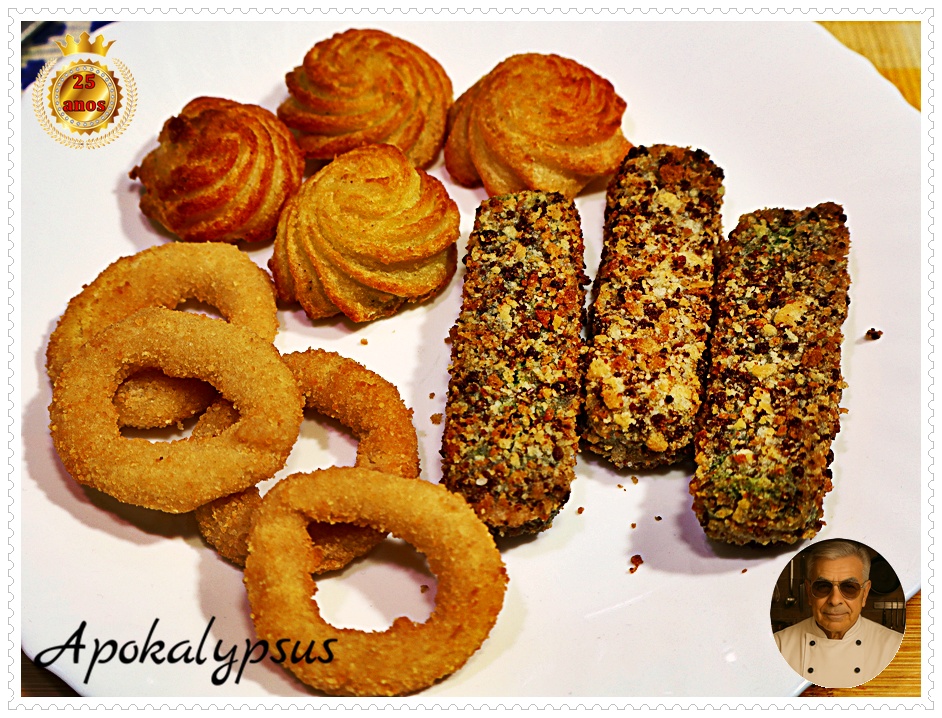 | Um, com as batatas Duchesse em cima e por baixo os aros de cebola panados. | |