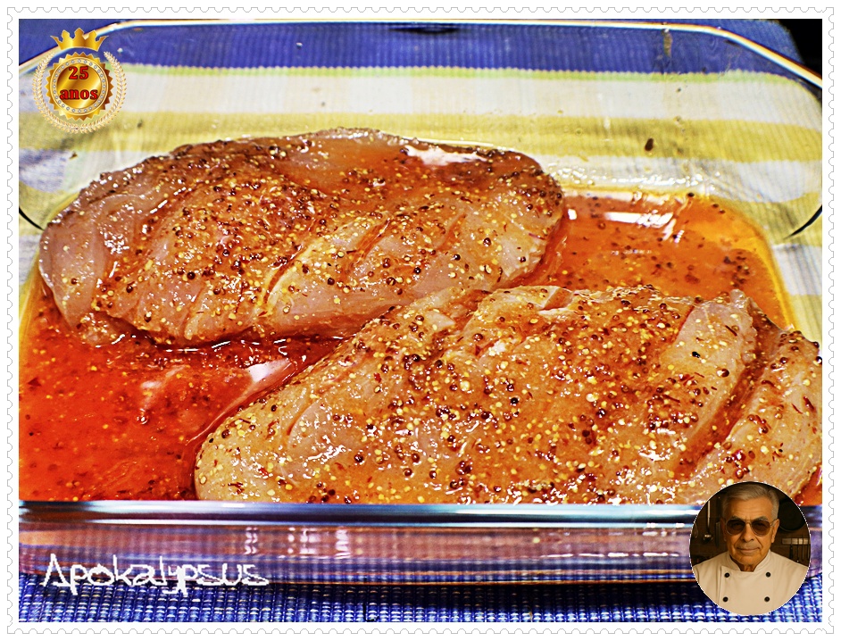 Faça golpes em diagonal até metade nos peitos de frango e tempere-os com sal. Numa tigela, misture bem a mostarda, a massa de alho, a massa de pimentão, o mel, o azeite, a pimenta Cayenne, pincele os peitos de frango com este molho e leve ao frigorífico durante ⏰60 minutos.