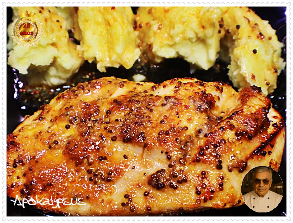 Verifique o ponto de cozedura da carne, e se necessário, repita o processo de pincelar com o molho e mostarda antes de cozinhar mais uma vez. Sirva de seguida com uma guarnição de puré de batata.