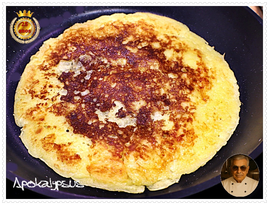 | Tape a frigideira (esqueci-me de o fazer) e em fogo muito baixo deixe dourar desse lado. E para finalizar, vire a massa do outro lado, volte a tapar a frigideira (esqueci-me de o fazer) e deixe alourar completamente. |