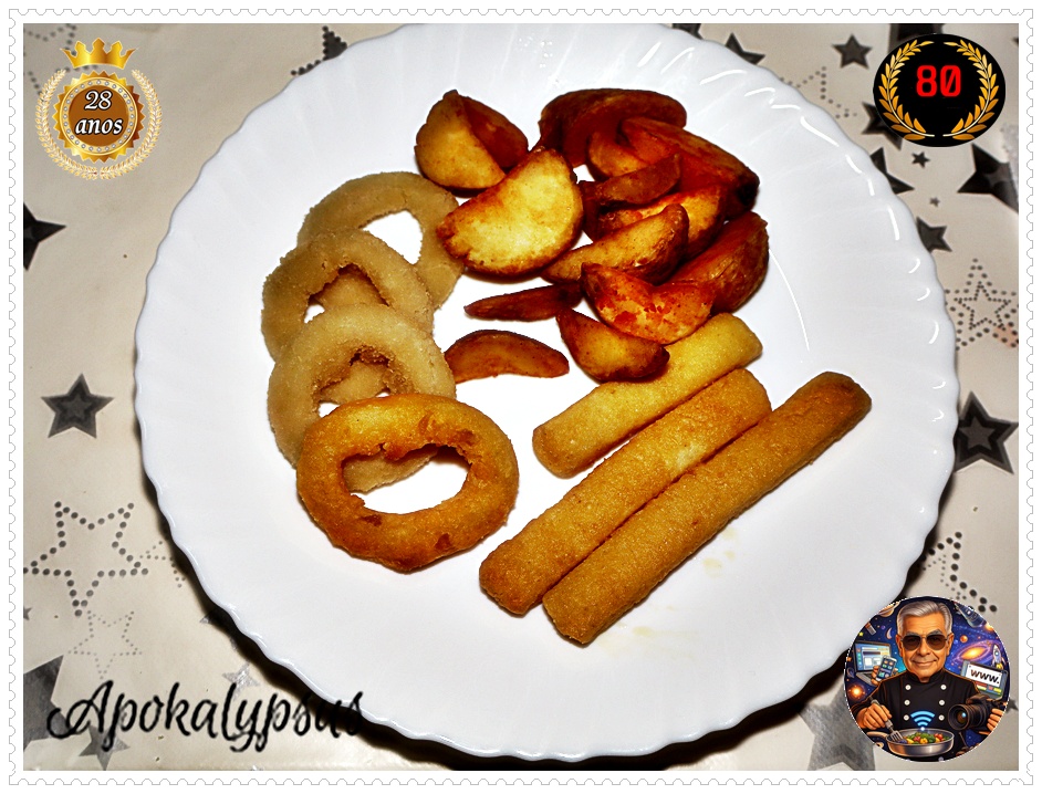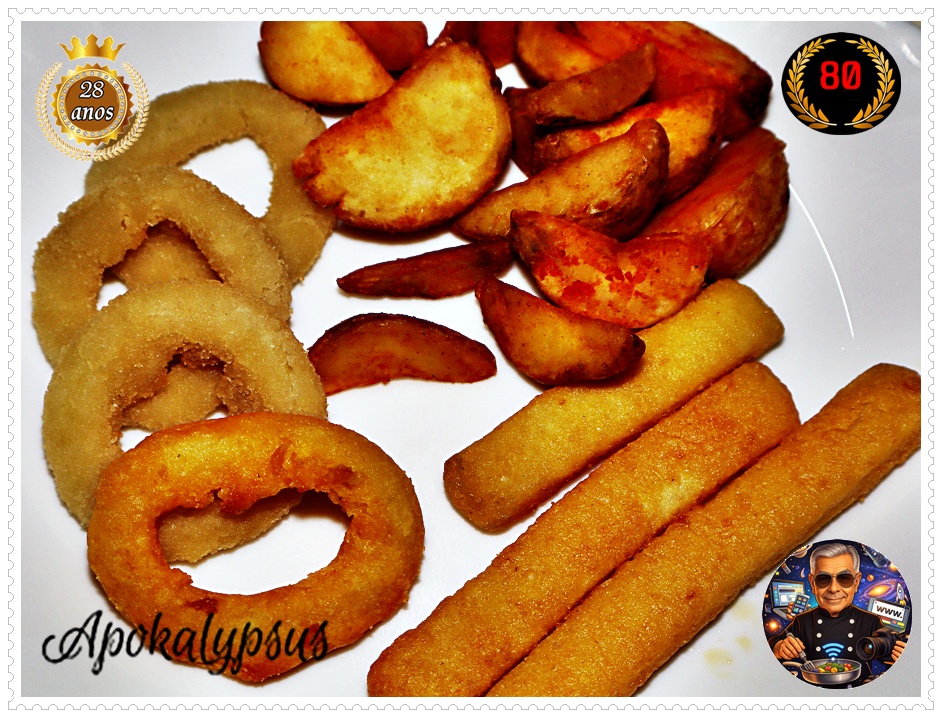 Tiras de Pota Panadas, Aros de Cebola e Batatas Wedge 🦑🧅🍟